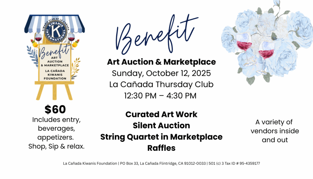 The La Cañada Kiwanis Benefit Art Auction & Marketplace, held at the La Cañada Thursday Club raises funds for local community programs youth leadership, and student scholarships. Tickets include wine, appetizers, and access to a silent auction of curated, historic, and contemporary art.